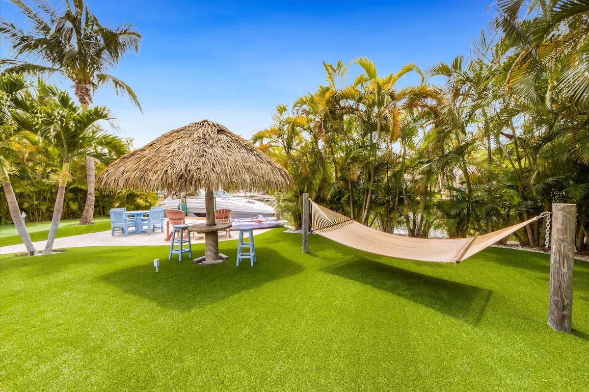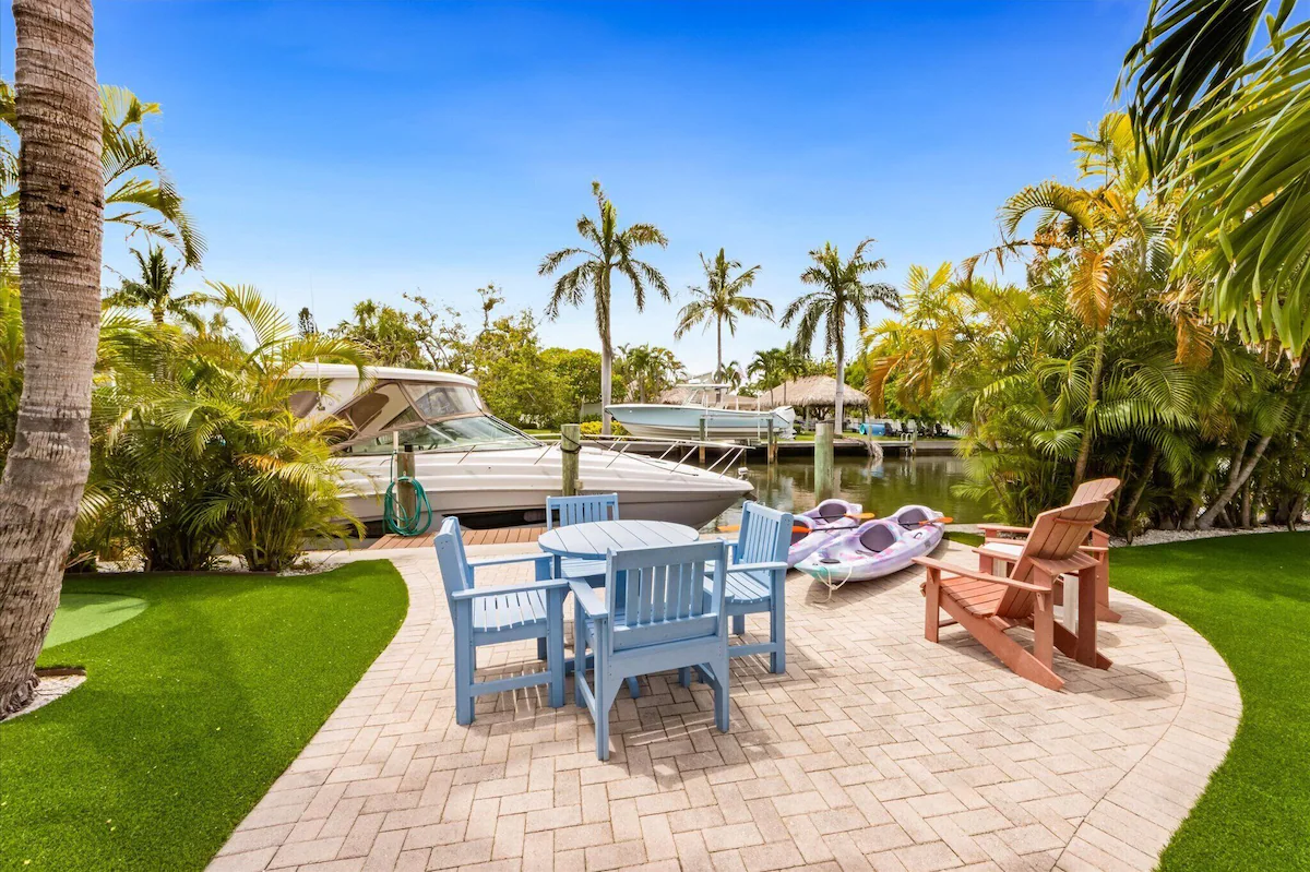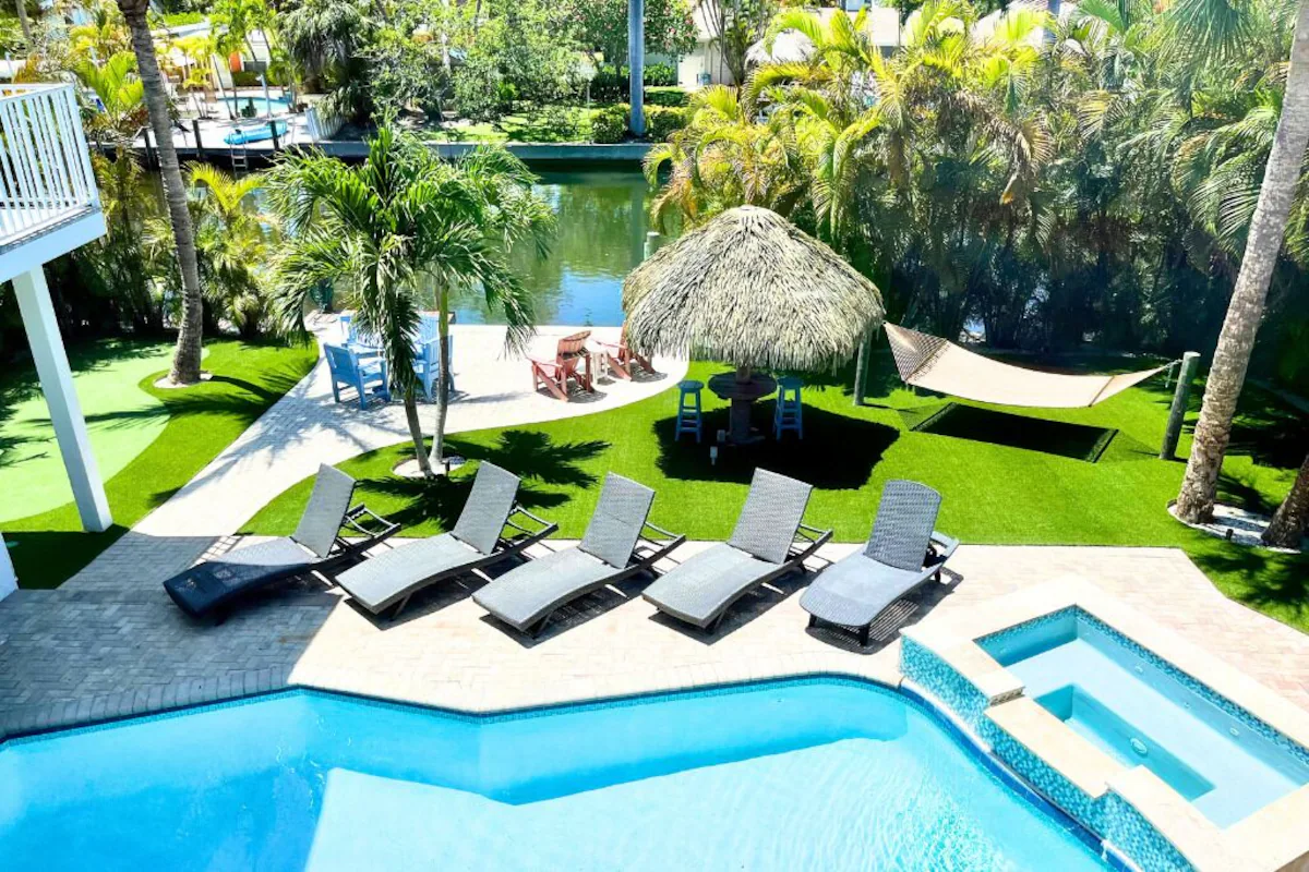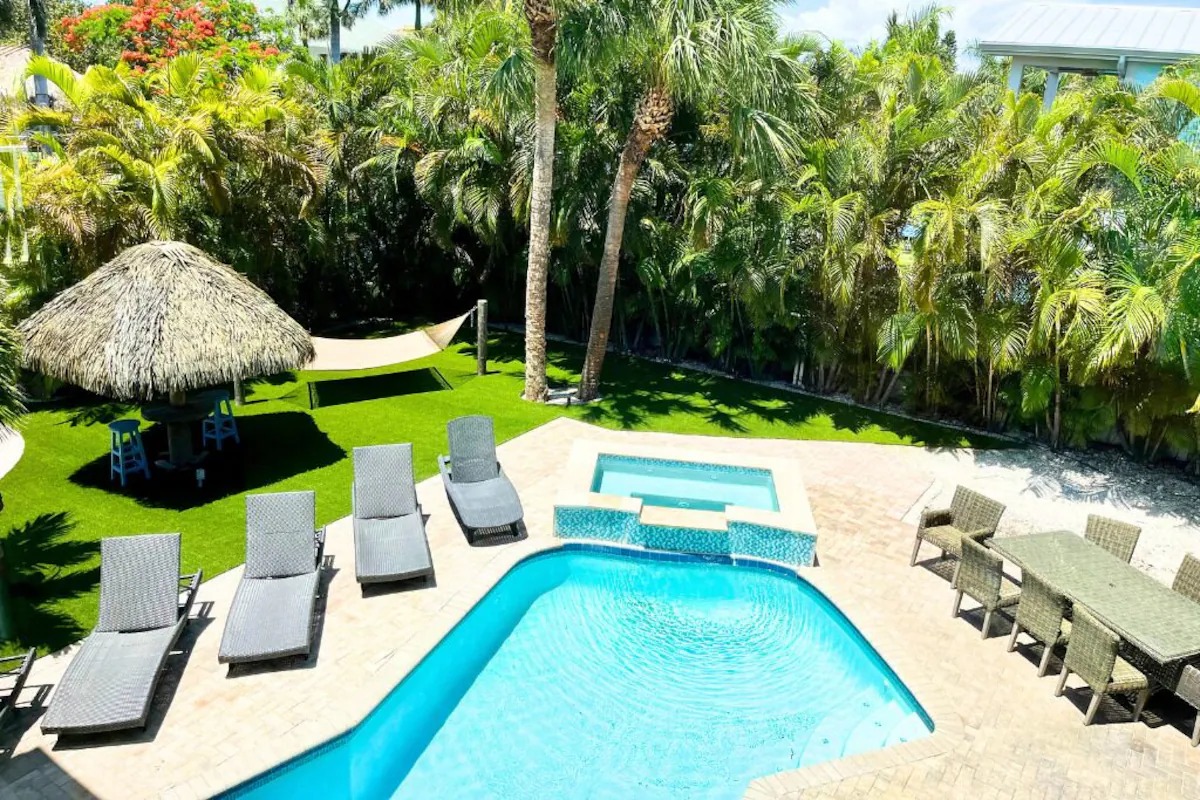 THE EXTERIOR ~ The large heated pool and large hot tub spa is located in a lush tropical setting and invites you to swim the day away. Play on the newly installed putting green right next to the waterfront dock. Catch a siesta on the sun loungers or cozy up with a good book in the lazy hammock shaded by the palm trees. Enjoy lunch “al fresco” at one of 2 outdoor dining tables next to the pool. The tiki hut is a favorite spot to gather for a cocktail, gaze at the canal and enjoy “island time”. The deepwater canal and private dock area at the backdoor for your enjoyment, perfect for fishing or renting a boat. Sirenia By The Sea offers direct access to Bimini Bay and the Gulf of Mexico (no bridges!). Bring your boat!